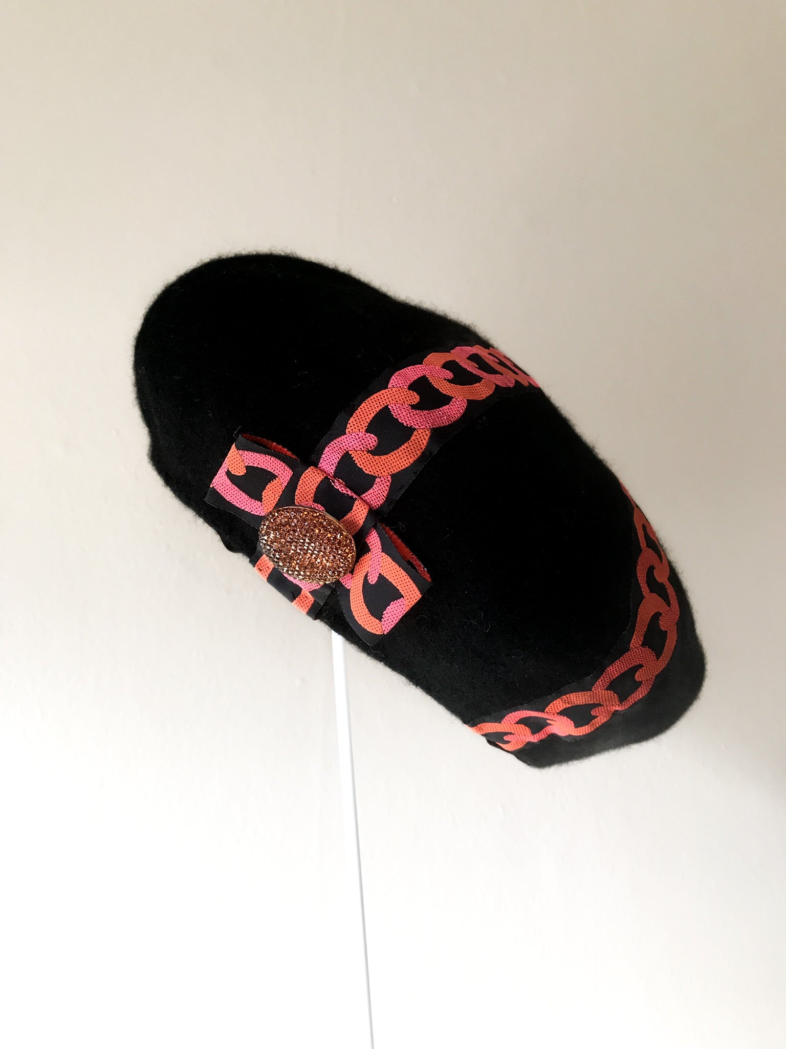 The chain motif ribbon serves as a prominent feature, evoking the geometric patterns and linear designs typical of Art Deco aesthetics. The chain motif adds a sense of refinement and intricacy to the beret, elevating its design and making it stand out as a statement piece.