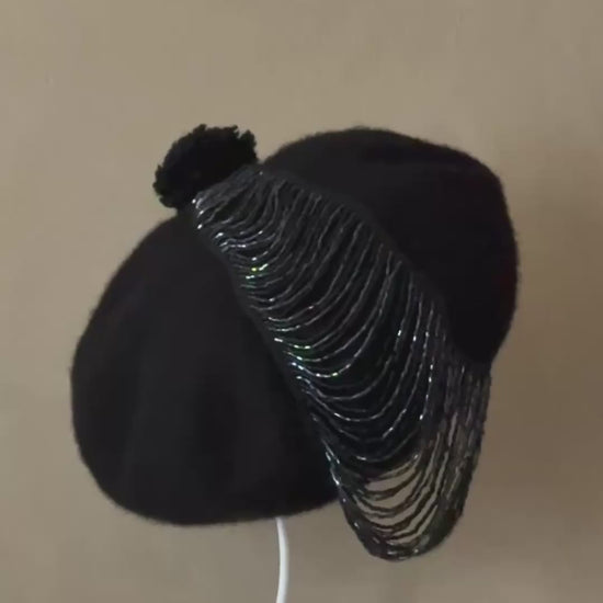 Wool Beret with 1920s Great Gatsby inspired black Beaded Fringe.